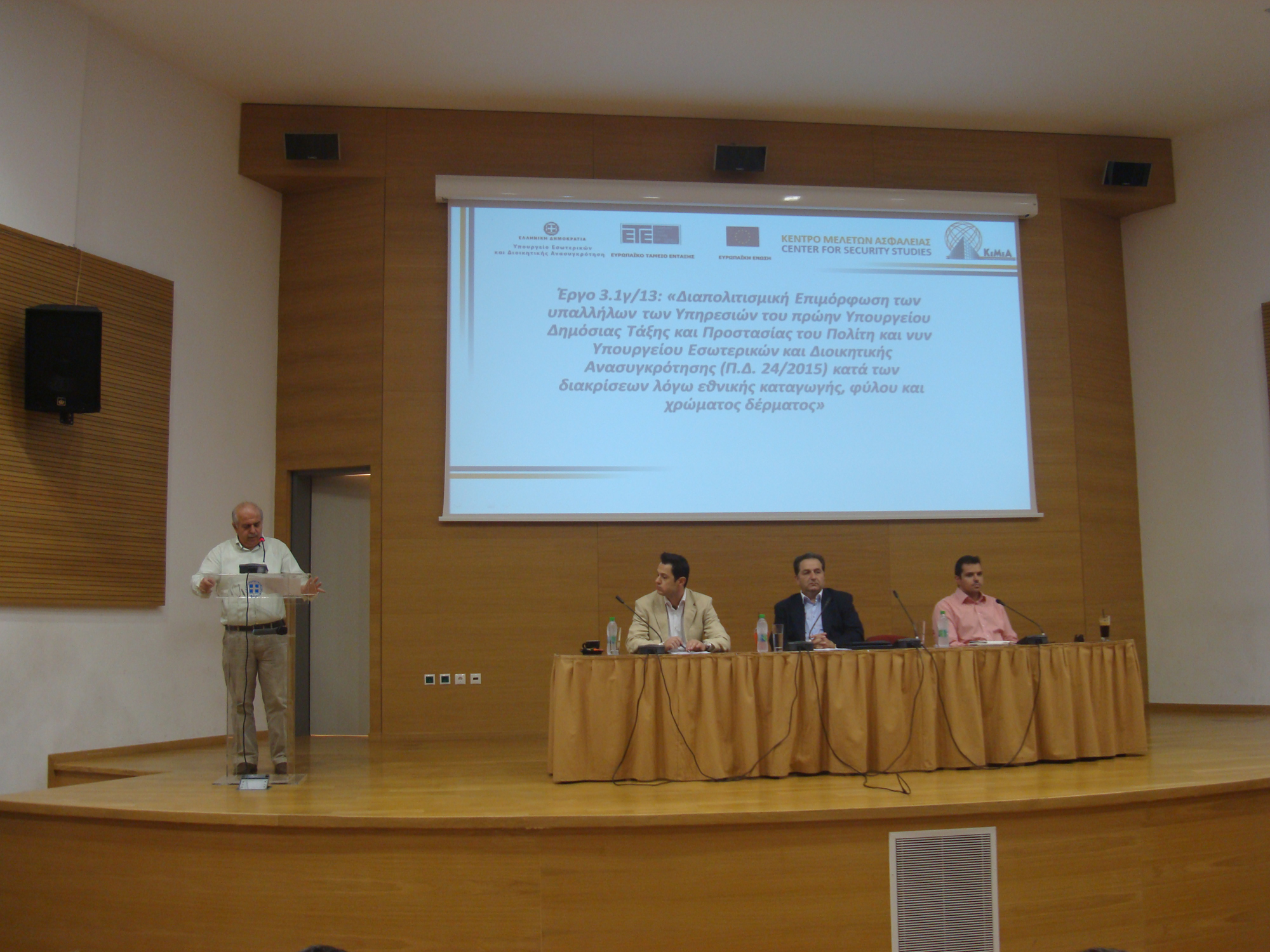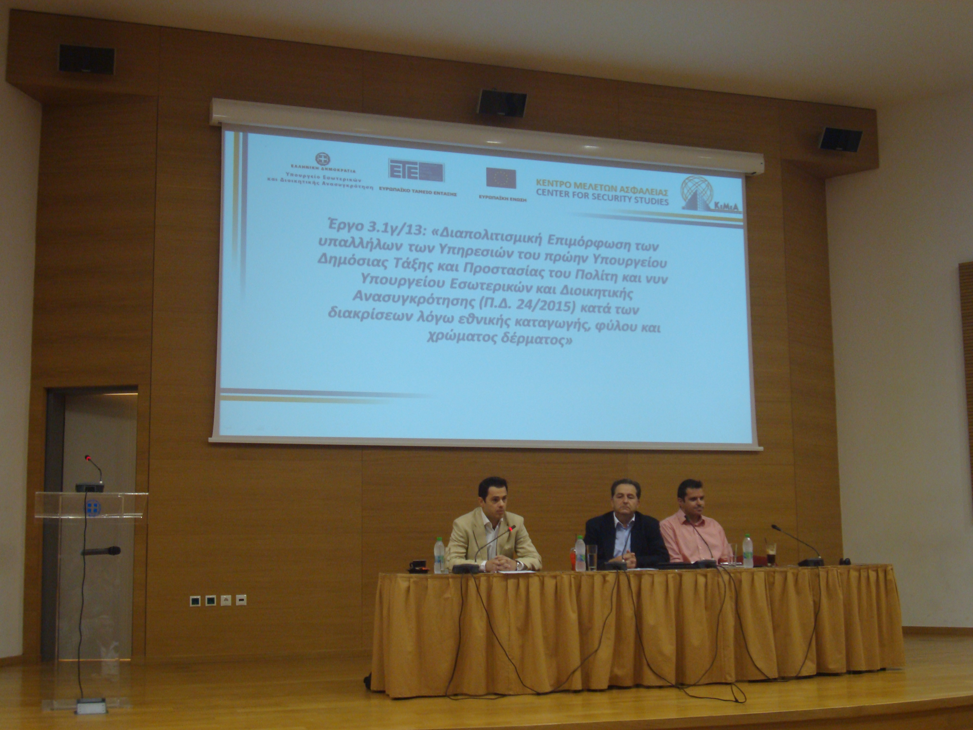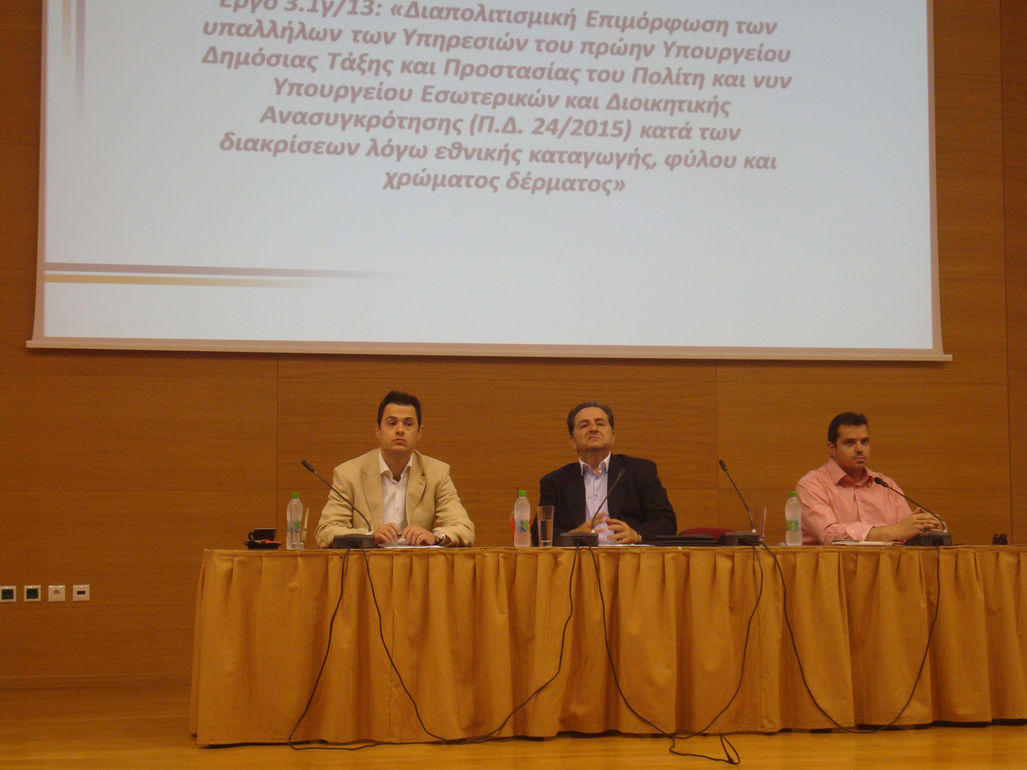 Ενημερωτική Ημερίδα για την ολοκλήρωση του Έργου 3.1.γ/13 για τη «Διαπολιτισμική Επιμόρφωση των υπαλλήλων των Υπηρεσιών του πρώην Υπουργείου Δημόσιας Τάξης και Προστασίας του Πολίτη και νυν Υπουργείου Εσωτερικών και Διοικητικής Ανασυγκρότησης (Π.Δ. 24/2015) κατά των διακρίσεων λόγω εθνικής καταγωγής, φύλου και χρώματος δέρματος» διοργανώθηκε από το ΚΕ.ΜΕ.Α με την υποστήριξη της Περιφερειακής Ενότητας Ευβοίας και του Δήμου Χαλκιδέων την Τετάρτη 24 Ιουνίου 2015 στο αμφιθέατρο του Συνεδριακού Κέντρου της Περιφερειακής Ενότητας Ευβοίας.